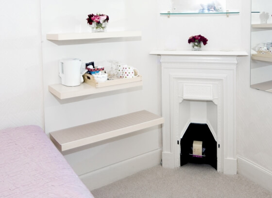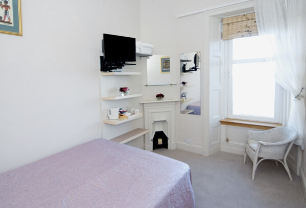 The small double or single room is a relaxing bedroom and has a comfortable double bed and period feature fireplace. This room has a private bathroom with a bath and overhead shower (not en-suite but for the exclusive use of guests in this room). There is a wonderful view across the Firth of Forth.